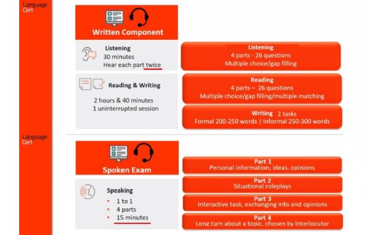 LanguageCert consists of two parts: Written Part (Listening, Reading, Writing — 3 hours 10 minutes) and Speaking Part (15 minutes’ exam interview), which can be taken at different times convenient for the candidate or retaken separately for 50% of the cost if one of the modules has not been passed well enough.